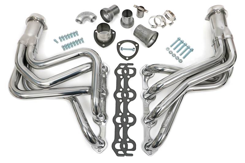 Handcrafted, Mild Steel Construction. Long Tube Header Design Provides Excellent Top-End Horsepower and Torque. Ball & Socket Collector Design requires No Gasket, and Allows For More Exhaust System Misalignment than Old School, Gasket-Style Header Collectors Includes All The Necessary Mounting Hardware, Gaskets and Reducers (exhaust adapters) Limted Lifetime Warranty On Construction, Five Year Warranty on Factory-Applied Header Coating!Details