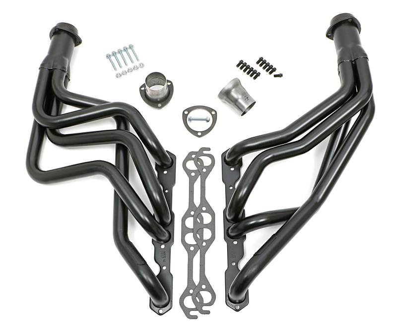 Long-Tube Headers For 67-81 Camaro 283-400, Close Ratio PS Specially Designed To Provide Additional Clearance For Larger, Close-Ratio (Quick Ratio) Steering Boxes Mild Steel, Long Tube Header Design Provides Better Top-End Horsepower and Torque. Ball & Socket Collector Design requires No Gasket, and Allows For More Exhaust System Misalignment than Old School, Gasket-Style Header Collectors Includes All The Necessary Mounting Hardware, Gaskets and Reducers (exhaust adapters) Limted Lifetime Warranty On Construction, Five Year Warranty on Factory-Applied Header Coating!