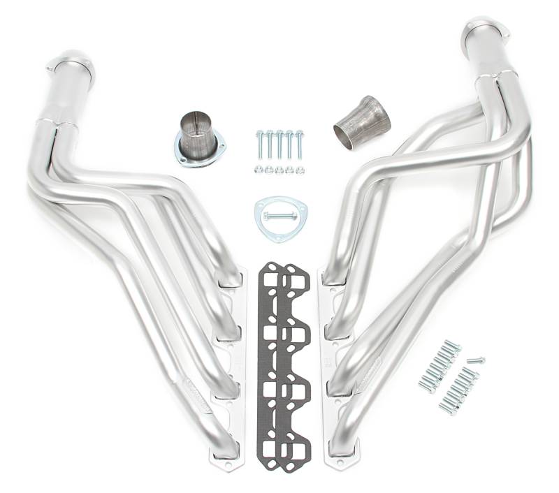 Heavy-Duty ELITE Header Construction With Thick 3/8 in. Flanges and 14g Primary Tubes To Hold Up To The Added Tortures Of High-Performance and Truck Engines. Thermal Coating Keeps More Heat In The Headers To Keep Underhood Temps Down and Protect Against Corrosion. Ball & Socket Collector Design requires No Gasket, and Allows For More Exhaust System Misalignment than Old School, Gasket-Style Header Collectors Includes All The Necessary Mounting Hardware, Gaskets and Reducers (exhaust adapters) Limted Lifetime Warranty On Construction, Five Year Warranty on Factory-Applied Header Coating!Details