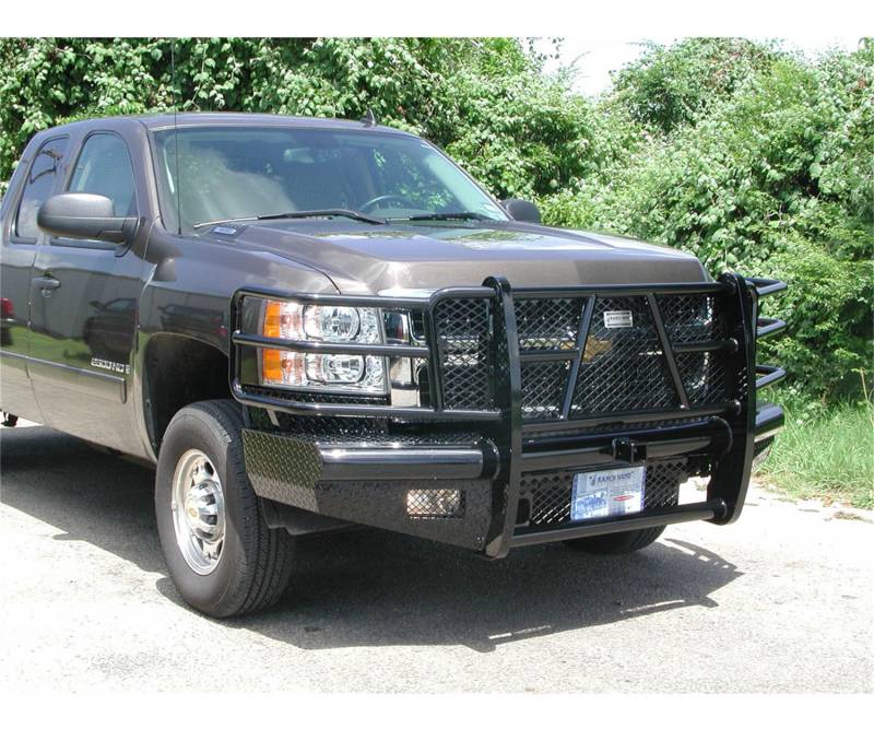 The Ranch Hand Legend front bumper is one of the toughest on the market. It is frame-mounted and has a one-piece, fully-welded construction that collectively reduces vibration, prevents rattling and ensures a secure fit. The main body of the bumper is manufactured from 4 in. schedule-40 pipe and diamond-plate steel, and the grille guard portion is composed of 12-gauge tubing, providing wraparound headlight protection. The punched plate grille insert is specifically designed to match the make and model of the truck with no expanded metal used. The Legend bumper comes standard with a 2 in. receiver, and most applications keep tow hooks and factory fog lights. It is constructed with a super polyester black powder coat finish to defend against corrosion for ultimate protection and durability. Originally designed for ranchers and farmers that needed more than a tough looking bumper -- but rather one that could assist in a full days work -- this is the iconic ranch-style bumper that started it all and paved the way for those behind it that only aspire to duplicate. This particular Legend bumper with grille guard fits select model years of the Chevrolet Silverado 2500 HD (see application info to verify fitment).