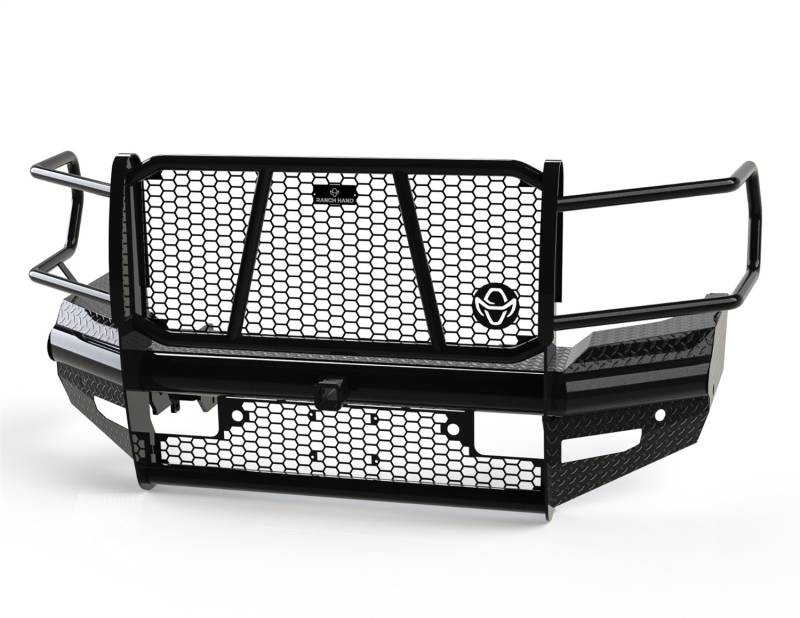 The Ranch Hand Legend front bumper is one of the toughest on the market. It is frame-mounted and has a one-piece, fully-welded construction that collectively reduces vibration, prevents rattling and ensures a secure fit. The main body of the bumper is manufactured from 4 in. schedule-40 pipe and diamond-plate steel, and the grille guard portion is composed of 12-gauge tubing, providing wraparound headlight protection. The punched plate grille insert is specifically designed to match the make and model of the truck with no expanded metal used. The Legend bumper comes standard with a 2 in. receiver, and most applications keep tow hooks and factory fog lights. It is constructed with a super polyester black powder coat finish to defend against corrosion for ultimate protection and durability. Originally designed for ranchers and farmers that needed more than a tough looking bumper -- but rather one that could assist in a full days work -- this is the iconic ranch-style bumper that started it all and paved the way for those behind it that only aspire to duplicate. This particular Legend bumper with grille guard fits select model years of the Ram 2500 and Ram 3500 (see application info to verify fitment).
