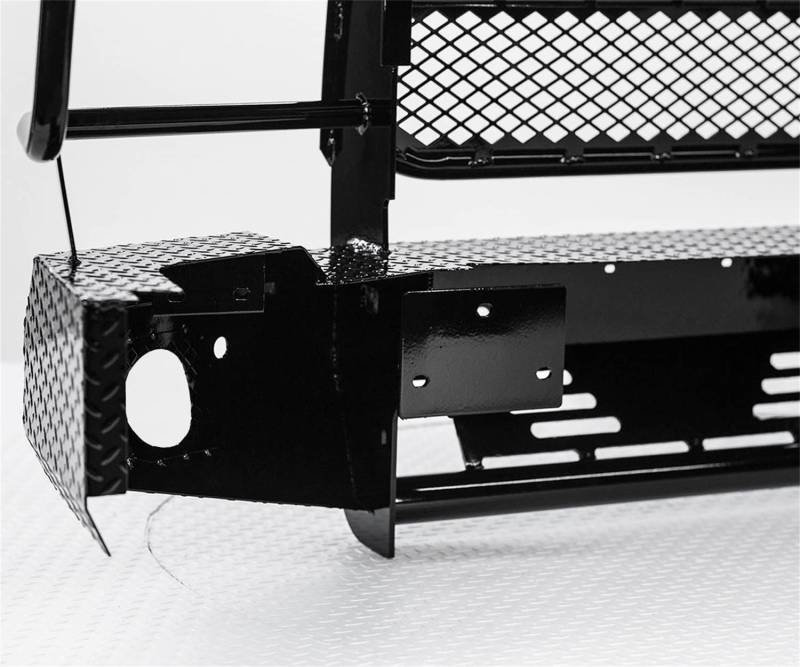 The Summit front bumper with grille guard provides superior strength, while offering an alternative style with reduced weight. This bumper is frame-mounted and features a one-piece, fully welded construction for a clean, seamless look. The main body of the bumper is manufactured from diamond-plate steel, and the grille guard portion provides wraparound brush guards for extra front-end and headlight protection. The punched plate grille insert is specifically designed to match the make and model of the vehicle with no expanded metal used. This particular Summit bumper with grille guard fit select model years of the GMC Sierra 2500 HD and GMC Sierra 3500 HD (see application info to verify fitment). The Summit has a streamlined construction which allows for maximum strength and simple installation without the need to do any additional cutting, welding or drilling. It is highly resistant to rust and corrosion with its tough black powder coat finish, strengthening its durability to last through the hard work your truck goes through day after day.