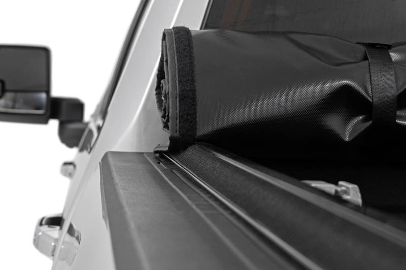 All-Weather Bed Protection: Rough Country's Soft Roll-Up Bed Cover delivers reliable protection against the elements while preserving full bed functionality. Constructed from high-quality, marine-grade vinyl with a sleek matte black finish, this durable cover features heavy-duty hook-and-loop side seals and tight front and rear barriers to shield your cargo from rain, dust, and debris.Streamlined Low-Profile Design: Sitting just 1-1/8" above the bed, this top-mount cover blends seamlessly with your truck's lines for a clean, stylish look. The corrosion-resistant, black powder-coated aluminum frame offers long-lasting strength without sacrificing style or aerodynamics.Fast and Easy Bed Access: The roll-up design and spring-latch closure system make opening and closing the cover a breeze. A single cable pull lets you release the latch quickly, giving you fast access to your full bed whenever you need it. Whether you're hauling gear or unloading tools, convenience comes standard. Effortless Installation: No drilling required - this cover installs in just 20 minutes using the included bracket system and tools. It mounts securely to your factory bed rails for a snug, hassle-free fit you can count on.Protected by a 5-Year Warranty: Rough Country backs this Soft Roll-Up Bed Cover with a 5-Year Replacement Warranty, protecting against structural and workmanship defects so you can hit the road with total confidence.