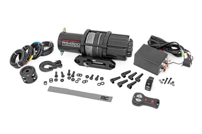 When you need a helping hand with your side by side or ATV, you can count on Rough Country's 4500lb UTV Winch to aid in recovery in any murky situation. Loaded with a 50-ft synthetic rope and clevis hook, this powerful UTV recovery system offers a robust 4,500lb line pull with a 166:1 gear ratio for plenty of power to get you back on the trail. Rough Country Winches feature a water-resistant solenoid and receiver box that keeps on ticking even when up against the elements.\ Rough Country's 4,500LB UTV Winch System features an ultra-durable synthetic rope that's flexible and won't kink or fragment like steel ropes while also being lighter weight and safer to use! Each winch includes a hawse fairlead and on/off rocker switch for easy operation. Upgrade your UTV or ATV with a Rough Country recovery system and be ready for whatever the trail throws your way!