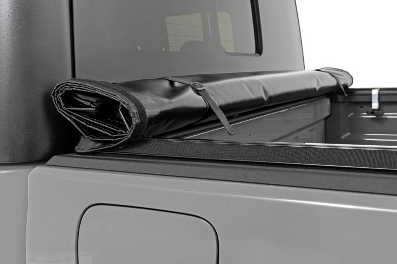 All-Weather Bed Protection: Rough Country's Soft Roll-Up Bed Cover delivers reliable protection against the elements while preserving full bed functionality. Constructed from high-quality, marine-grade vinyl with a sleek matte black finish, this durable cover features heavy-duty hook-and-loop side seals and tight front and rear barriers to shield your cargo from rain, dust, and debris.Streamlined Low-Profile Design: Sitting just 1-1/8" above the bed, this top-mount cover blends seamlessly with your truck's lines for a clean, stylish look. The corrosion-resistant, black powder-coated aluminum frame offers long-lasting strength without sacrificing style or aerodynamics.Fast and Easy Bed Access: The roll-up design and spring-latch closure system make opening and closing the cover a breeze. A single cable pull lets you release the latch quickly, giving you fast access to your full bed whenever you need it. Whether you're hauling gear or unloading tools, convenience comes standard. Effortless Installation: No drilling required - this cover installs in just 20 minutes using the included bracket system and tools. It mounts securely to your factory bed rails for a snug, hassle-free fit you can count on.Protected by a 5-Year Warranty: Rough Country backs this Soft Roll-Up Bed Cover with a 5-Year Replacement Warranty, protecting against structural and workmanship defects so you can hit the road with total confidence.