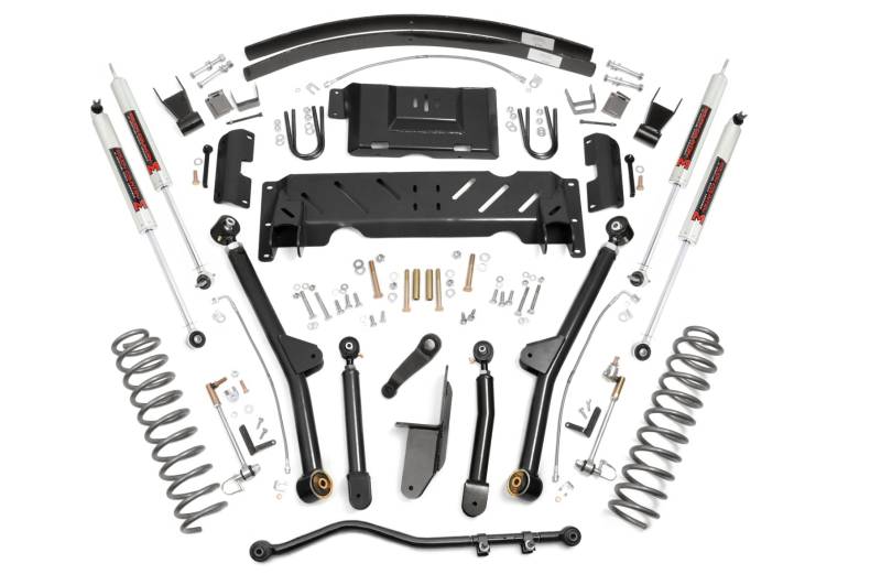 Unleash Your XJ's Full Potential: Take your Jeep Cherokee XJ's already capable platform to the next level with Rough Country's 4.5-inch Long Arm Suspension Kit. This fully bolt-on upgrade relocates the front control arms to achieve optimum alignment angles while delivering insane articulation for superior off-road performance. Engineered for Maximum Strength: Featuring heavy-duty high-clearance lower control arms and extreme-travel long arms, this system keeps your suspension geometry dialed in while boosting ground clearance. X-Flex control arms are equipped with Clevite OEM-style rubber bushings and oversized flex joints with a massive 2.5-inch body and 1.25-inch threads. Fully greasable and built for longevity, these arms allow upper joints to pivot up to 20 degrees and lower joints up to 35 degrees, perfect for conquering uneven terrain.Premium Shock Performance: Choose from Rough Country's advanced shock lineup, including N3, V2, or M1 monotube options, each engineered for a perfect balance of on-road comfort and off-road control. All shocks feature 10-stage variable valving, a high-pressure nitrogen charge, durable 18mm spring-loaded piston rods, and oversized shock bodies for faster cooling, enhanced ride quality, and long-lasting durability.Customize Your Ride: Available with add-a-leaf springs for a cost-effective lift or full replacement leaf packs for premium ride quality and strength.Unmatched Value: Get top-quality craftsmanship, extreme off-road capability, and long-lasting durability, all at an unbeatable price backed by Rough Country's trusted reputation.
