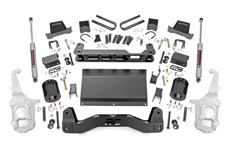 Turn your Ford F-150 into the ultimate road-and-trail champion with Rough Country's 6-Inch Lift Kit. Designed to conquer everything from rugged trails to your daily drive, this kit delivers the perfect stance, unbeatable ground clearance, and the confidence to tackle any challenge. It enhances ride quality while giving your truck the bold, capable look your adventures demand. This isn't just a lift-it's a complete truck upgrade.Serious Ground Clearance: More room for adventure! This lift gives your F-150 the height it needs to clear obstacles on the trail and look commanding on the road.Levels Front and Rear: Say farewell to that factory nose-down look. This kit evens things out, giving your truck a clean, aggressive stance that screams confidence.Precision Engineered Aluminum Knuckles: A standout feature you won't find with any other brand. Engineered to outperform steel, these knuckles are 50% lighter, delivering improved handling and a better ride quality. Outstanding corrosion resistance ensures superior performance and long-lasting durability, making them the ultimate choice for any terrain.Customizable Shock Options: Take control of your ride with Rough Country's 6-Inch Lift Kit, offering a range of shock options to match your off-road needs. Choose from the durable nitrogen-charged N3 shocks or upgrade to the high-performance Vertex reservoir shocks for maximum control on tough terrain. The choice is yours for the ultimate off-road experience.Durable Protective Skid Plate: Rocks? Debris? Bring it on. The included skid plate shields your truck's underside from trail hazards, keeping your investment safe while you play hard.Fabricated Rear Blocks: Tougher than cast alternatives, these anti-axle wrap blocks keep your truck steady and reliable, mile after mile.Installation and Warranty: Transform your F-150 with our all-inclusive 6-inch Lift Kit, featuring durable aluminum knuckles, a skid plate, and all the hardware for a factory-like setup with extra ground clearance. Plus, enjoy peace of mind with Rough Country's limited lifetime warranty, protecting against structural and workmanship defects.This isn't your average lift kit. With premium components and attention to detail, it's designed to handle everything from weekend overlanding to weekday commutes. The lightweight knuckles enhance steering, while the skid plate provides unbeatable protection. Plus, we didn't skimp on style-your F-150 will stand taller, ride smoother, and look downright awesome.