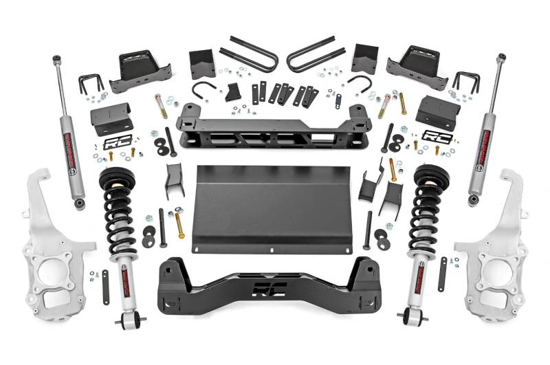 Turn your Ford F-150 into the ultimate road-and-trail champion with Rough Country's 6-Inch Lift Kit. Designed to conquer everything from rugged trails to your daily drive, this kit delivers the perfect stance, unbeatable ground clearance, and the confidence to tackle any challenge. It enhances ride quality while giving your truck the bold, capable look your adventures demand. This isn't just a lift-it's a complete truck upgrade.Serious Ground Clearance: More room for adventure! This lift gives your F-150 the height it needs to clear obstacles on the trail and look commanding on the road.Levels Front and Rear: Say farewell to that factory nose-down look. This kit evens things out, giving your truck a clean, aggressive stance that screams confidence.Precision Engineered Aluminum Knuckles: A standout feature you won't find with any other brand. Engineered to outperform steel, these knuckles are 50% lighter, delivering improved handling and a better ride quality. Outstanding corrosion resistance ensures superior performance and long-lasting durability, making them the ultimate choice for any terrain.Customizable Shock Options: Take control of your ride with Rough Country's 6-Inch Lift Kit, offering a range of shock options to match your off-road needs. Choose from the durable nitrogen-charged N3 shocks or upgrade to the high-performance Vertex reservoir shocks for maximum control on tough terrain. The choice is yours for the ultimate off-road experience.Durable Protective Skid Plate: Rocks? Debris? Bring it on. The included skid plate shields your truck's underside from trail hazards, keeping your investment safe while you play hard.Fabricated Rear Blocks: Tougher than cast alternatives, these anti-axle wrap blocks keep your truck steady and reliable, mile after mile.Installation and Warranty: Transform your F-150 with our all-inclusive 6-inch Lift Kit, featuring durable aluminum knuckles, a skid plate, and all the hardware for a factory-like setup with extra ground clearance. Plus, enjoy peace of mind with Rough Country's limited lifetime warranty, protecting against structural and workmanship defects.This isn't your average lift kit. With premium components and attention to detail, it's designed to handle everything from weekend overlanding to weekday commutes. The lightweight knuckles enhance steering, while the skid plate provides unbeatable protection. Plus, we didn't skimp on style-your F-150 will stand taller, ride smoother, and look downright awesome.
