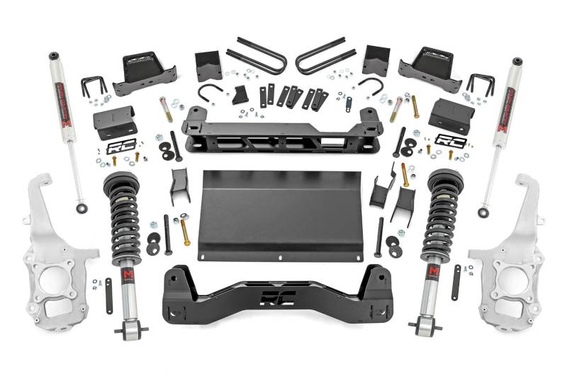 Turn your Ford F-150 into the ultimate road-and-trail champion with Rough Country's 6-Inch Lift Kit. Designed to conquer everything from rugged trails to your daily drive, this kit delivers the perfect stance, unbeatable ground clearance, and the confidence to tackle any challenge. It enhances ride quality while giving your truck the bold, capable look your adventures demand. This isn't just a lift-it's a complete truck upgrade.Serious Ground Clearance: More room for adventure! This lift gives your F-150 the height it needs to clear obstacles on the trail and look commanding on the road.Levels Front and Rear: Say farewell to that factory nose-down look. This kit evens things out, giving your truck a clean, aggressive stance that screams confidence.Precision Engineered Aluminum Knuckles: A standout feature you won't find with any other brand. Engineered to outperform steel, these knuckles are 50% lighter, delivering improved handling and a better ride quality. Outstanding corrosion resistance ensures superior performance and long-lasting durability, making them the ultimate choice for any terrain.Customizable Shock Options: Take control of your ride with Rough Country's 6-Inch Lift Kit, offering a range of shock options to match your off-road needs. Choose from the durable nitrogen-charged N3 shocks or upgrade to the high-performance Vertex reservoir shocks for maximum control on tough terrain. The choice is yours for the ultimate off-road experience.Durable Protective Skid Plate: Rocks? Debris? Bring it on. The included skid plate shields your truck's underside from trail hazards, keeping your investment safe while you play hard.Fabricated Rear Blocks: Tougher than cast alternatives, these anti-axle wrap blocks keep your truck steady and reliable, mile after mile.Installation and Warranty: Transform your F-150 with our all-inclusive 6-inch Lift Kit, featuring durable aluminum knuckles, a skid plate, and all the hardware for a factory-like setup with extra ground clearance. Plus, enjoy peace of mind with Rough Country's limited lifetime warranty, protecting against structural and workmanship defects.This isn't your average lift kit. With premium components and attention to detail, it's designed to handle everything from weekend overlanding to weekday commutes. The lightweight knuckles enhance steering, while the skid plate provides unbeatable protection. Plus, we didn't skimp on style-your F-150 will stand taller, ride smoother, and look downright awesome.