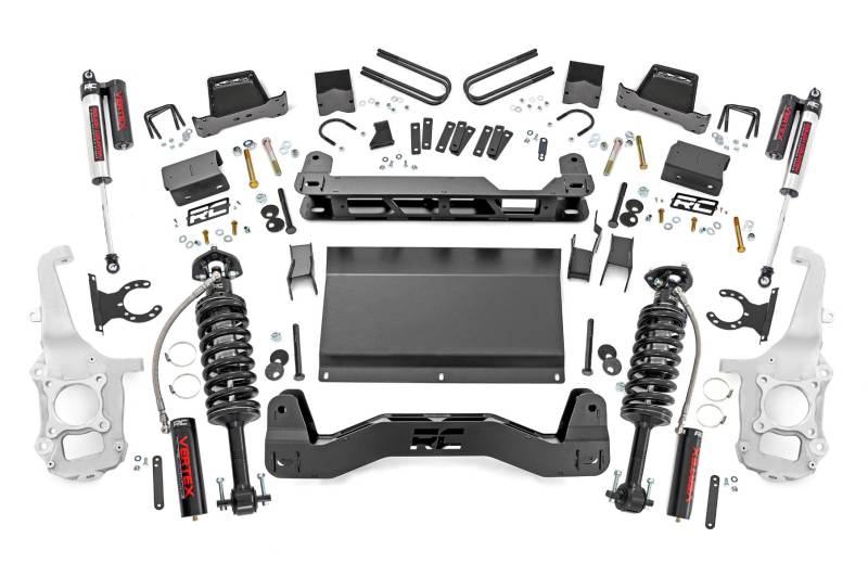 Turn your Ford F-150 into the ultimate road-and-trail champion with Rough Country's 6-Inch Lift Kit. Designed to conquer everything from rugged trails to your daily drive, this kit delivers the perfect stance, unbeatable ground clearance, and the confidence to tackle any challenge. It enhances ride quality while giving your truck the bold, capable look your adventures demand. This isn't just a lift-it's a complete truck upgrade.Serious Ground Clearance: More room for adventure! This lift gives your F-150 the height it needs to clear obstacles on the trail and look commanding on the road.Levels Front and Rear: Say farewell to that factory nose-down look. This kit evens things out, giving your truck a clean, aggressive stance that screams confidence.Precision Engineered Aluminum Knuckles: A standout feature you won't find with any other brand. Engineered to outperform steel, these knuckles are 50% lighter, delivering improved handling and a better ride quality. Outstanding corrosion resistance ensures superior performance and long-lasting durability, making them the ultimate choice for any terrain.Customizable Shock Options: Take control of your ride with Rough Country's 6-Inch Lift Kit, offering a range of shock options to match your off-road needs. Choose from the durable nitrogen-charged N3 shocks or upgrade to the high-performance Vertex reservoir shocks for maximum control on tough terrain. The choice is yours for the ultimate off-road experience.Durable Protective Skid Plate: Rocks? Debris? Bring it on. The included skid plate shields your truck's underside from trail hazards, keeping your investment safe while you play hard.Fabricated Rear Blocks: Tougher than cast alternatives, these anti-axle wrap blocks keep your truck steady and reliable, mile after mile.Installation and Warranty: Transform your F-150 with our all-inclusive 6-inch Lift Kit, featuring durable aluminum knuckles, a skid plate, and all the hardware for a factory-like setup with extra ground clearance. Plus, enjoy peace of mind with Rough Country's limited lifetime warranty, protecting against structural and workmanship defects.This isn't your average lift kit. With premium components and attention to detail, it's designed to handle everything from weekend overlanding to weekday commutes. The lightweight knuckles enhance steering, while the skid plate provides unbeatable protection. Plus, we didn't skimp on style-your F-150 will stand taller, ride smoother, and look downright awesome.