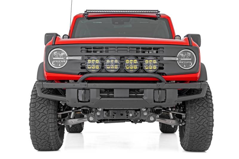 Late-night adventures or early-morning hunts just got a whole lot brighter. Rough Country's Ford Bronco Light Bar Mount is designed to seamlessly fit your factory Modular bumper, enhancing both style and functionality. Illuminate the trail, spotlight your campsite, and tackle any off-road challenge with confidence.Precision Fit & Versatile Design: Custom-built for the Bronco OE modular bumper, this mount can be used as a sleek low bar option without lights for a clean, aggressive look, or equipped with lights to maximize visibility. Your Bronco, your way.Ample Lighting Capacity: Holds up to four of the 6.5" round lights or six of the 3.5" round lights, giving you the flexibility to light up the trail or your campsite. Optional setups deliver up to 28,080 lumens with 6.5" lights or 9,720 lumens with 3.5" lights.Heavy-Duty Construction: Crafted from 11-gauge steel with a 1 7/8" OD tube, this mount is built tough to withstand the rigors of off-roading, ensuring your investment lasts as long as your adventures.Simple, No-Hassle Installation: Bolts directly to factory mounting points with no drilling required. Spend less time installing and more time exploring.Durable, Long-Lasting Finish: Coated to resist rust and corrosion, keeping your mount looking great and performing at its best season after season.Whether you're conquering rugged trails, fishing at dawn, or camping under the stars, the Rough Country Ford Bronco Light Bar Mount ensures you won't miss a thing. Rugged, functional, and ready for adventure, upgrade your Bronco and light the way today!