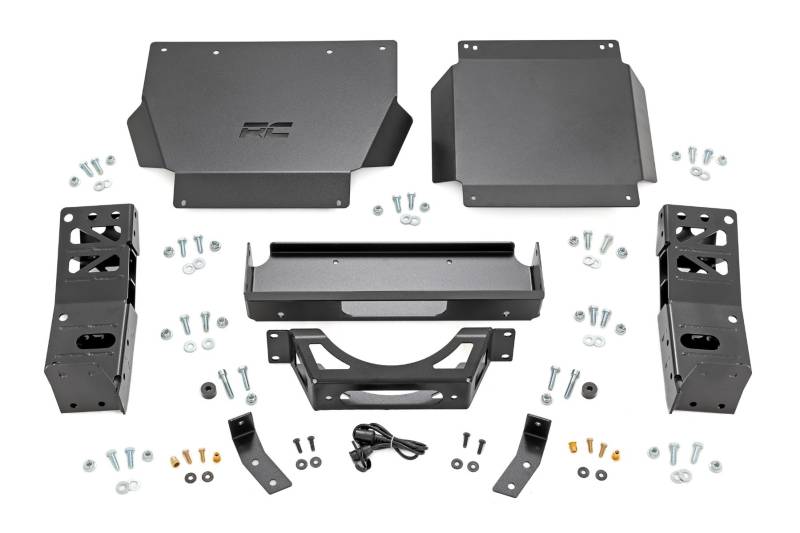 - Heavy-Duty Winch Tray: Built from 7-gauge steel for maximum strength and durability.\ Reinforced Skid Plates: 11-gauge steel with an integrated design for superior undercarriage protection.\ Signature RC Style: Front skid plate features a precision laser-cut Rough Country logo.\ Enhanced Protection: Includes a differential skid plate to shield vital drivetrain components.\ Hassle-Free Installation: Bolt-on structural design simplifies the mounting process.\ Factory Integration: Bumper wing supports mount directly to factory intrusion bars for a secure fit.\ Winch-Ready Design: Engineered for seamless compatibility with Rough CountryΓÇÖs PRO9500S and PRO12000S winches.\ Rugged Finish: Flat black powder coat resists corrosion and blends seamlessly with your vehicleΓÇÖs exterior..