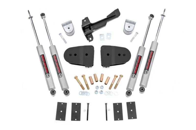 Superior Looks. Give your Ford Super Duty Tremor an impressive upgrade, front to back with Rough Country's 3" Suspension Lift Kit! This easy-to-install lift kit raises the front of your vehicle to be equal height with the rear for a leveled, better-than-stock look that gives an improved ride height and a more aggressive appearance.\ Durable Components.This kit features a set of front, lifted coil springs spacers allowing you to gain additional ride height without sacrificing ride quality or performance. A set of radius arm drop brackets as well as a track bar drop bracket is provided to keep everything at optimum angles for a factory-like ride, even after lifting. A set of Rough Country's premium V2 monotube shocks are also included. The V2 Monotube Shock Absorber is more than an upgrade - It's a true performance shock. Each shock features a T6061 brushed aluminum body with black anodized accents giving it a striking visual appearance that also dissipates heat faster than other materials. The internal 46mm high-flow piston offers countless years of durability.\ Installation. Requiring minor trimming to install, an estimated timeframe of 3-4 hours is recommended to complete this full installation. This full kit can be installed at home and can be completed efficiently and quickly!\ Limited Lifetime Replacement Warranty. Rough Country's 3-inch Suspension Lift Kit is backed with a limited lifetime replacement warranty towards manufacturer defects. As such, the product is protected from structural and workmanship damage after the date of purchase. With our industry-leading warranty give yourself peace of mind when using Rough Country's Suspension products!