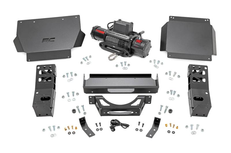 - Heavy-Duty Winch Tray: Built from 7-gauge steel for maximum strength and durability.\ Reinforced Skid Plates: 11-gauge steel with an integrated design for superior undercarriage protection.\ Signature RC Style: Front skid plate features a precision laser-cut Rough Country logo.\ Enhanced Protection: Includes a differential skid plate to shield vital drivetrain components.\ Hassle-Free Installation: Bolt-on structural design simplifies the mounting process.\ Factory Integration: Bumper wing supports mount directly to factory intrusion bars for a secure fit.\ Winch-Ready Design: Engineered for seamless compatibility with Rough CountryΓÇÖs PRO9500S and PRO12000S winches.\ Rugged Finish: Flat black powder coat resists corrosion and blends seamlessly with your vehicleΓÇÖs exterior..