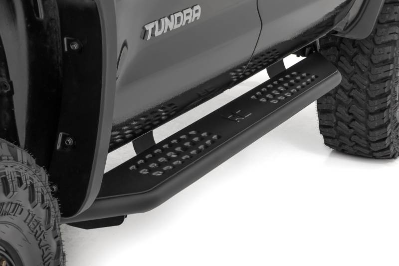 Rough Country's OV2 running board is the perfect combination of off-road style and function. These heavy-duty steel steps feature a rugged tubular construction for strength and rocker panel protection while still boasting a large area for secure footing. With rugged construction and easy installation, it's time to elevate your Toyota Tundra's performance and style.Rugged Durability: Made from durable steel and wrapped with a tubular side wall, the OV2 Running Boards offer reliable protection against rocks and debris the trail throws your way. The 1 3/4" inch steel tubing provides added body protection, ensuring your Tundra stays in top condition no matter where you go.Ample Stepping Area: With a generous 6 3/4-inch-wide stepping area, these running boards offer plenty of foot room, making it easy to enter and exit your Tundra, even with mud-caked boots.Corrosion Resistance: Finished with a durable powder coat, our running boards are built to withstand the elements and resist corrosion, so they'll look great for years to come. Easy Installation: Say goodbye to complicated installations. The OV2 Running Boards feature a no-drill installation process, allowing you to equip your Tundra for off-road adventures without the hassle.Peace of Mind: Rough Country stands behind the OV2 Running Boards with a limited lifetime warranty, so you can trust that our boards are a reliable investment for your Tundra.Whether you're navigating rocky trails or cruising through mud and sand, these running boards are the ultimate off-road companion, providing a sure step and unmatched protection for your rig.