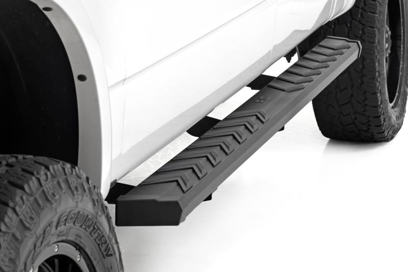 Ease of Access. Gain easier access to your cab with Rough Country's BA2 Running Board Side Steps. These high-quality replacements are a must-have for any lifted application. Offering a robust design and ample stepping area, your footing has never been safer.\ Durable Construction. Rough Country's BA2 Running Board Steps feature a comfortable, 5-inch wide stepping area with an integrated insert design that ensures foot placement when climbing in and out of your vehicle. Each running board features a durable powder-coated finish and a nonslip design that can support up to 500lbs!\ Installation. With no cutting or drilling required to install, installation couldn't be easier. With an estimated timeframe of 1-2 hours this full kit can be installed at home using standard tools and can be completed efficiently and quickly!\ 5-Year Replacement Warranty. Rough Country's BA2 Running Board Side Steps is backed with a five-year replacement warranty towards manufacturer defects. As such, the product is protected from structural and workmanship damage after the date of purchase. With our industry-leading warranty give yourself peace of mind when using Rough Country's Suspension products!