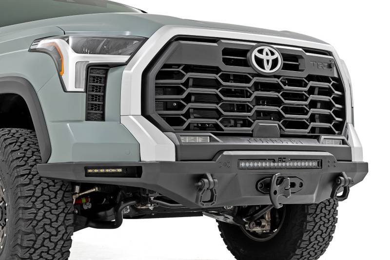 When you're pushing your Toyota Tundra to its limits on the trails, the last thing you want is a bumper that's not up to the challenge. The Rough Country Hybrid Front Bumper is designed to solve that problem, giving you the extra ground and tire clearance needed to navigate rugged terrain with ease.Enhanced Clearance: Built to provide more ground and tire clearance, this bumper allows you to conquer challenging off-road obstacles without the worry of scraping or getting hung up.Rugged Steel Construction: The exterior is made from 11-gauge steel, while the inner structure features 7-gauge steel, ensuring your bumper is ready to wit'stand the harshest conditions.Optimized Lighting Options: With spacefor 6" slimline lights on the wings and a 20" single-row light bar in the center, this bumper is designed to keep your path well-lit, no matter how dark the trail gets. We also include smoked amber LED lights to cover sensor holes on non-optioned trucks, blending function with style.Durable Recovery Points: Equipped with recovery points that accommodate standard 3/4" D-Rings with a 7/8" pin diameter, this bumper is ready for any situation, providing reliable points for recovery operations.Whether you're hitting the backcountry for a weekend adventure or need a more capable setup for daily driving, the Rough Country Hybrid Front Bumper for your Toyota Tundra is designed to meet those demands with strength and style.