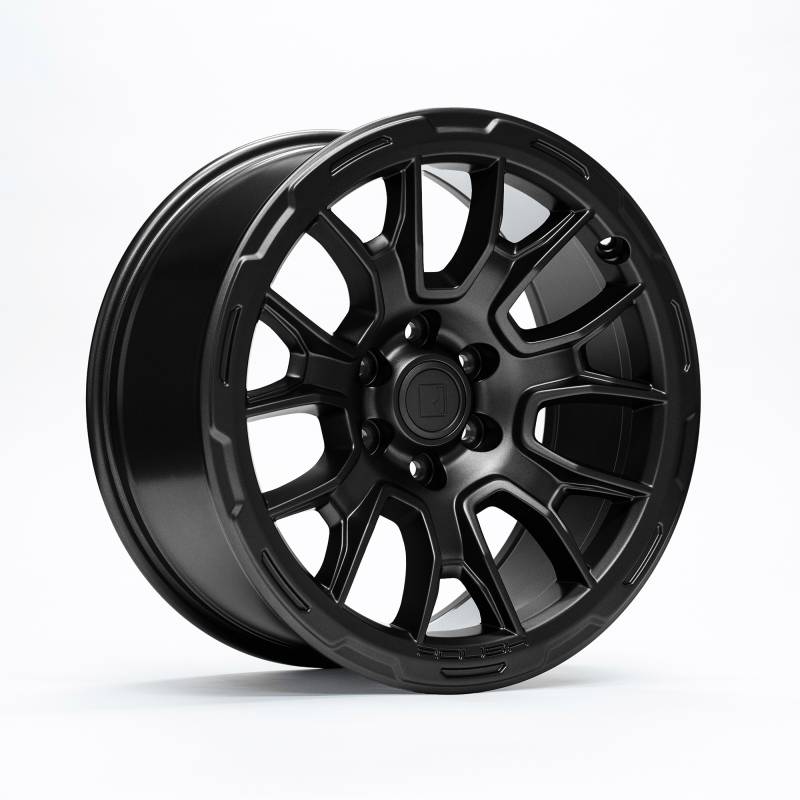 Engineered for the adventurous, the wheels feature a robust outer bead, ensuring durability and resilience for all your off-road journeys. The innovative center design isn't just for looks; it enhances brake cooling, making your rides smoother and safer. The bold 20-inch size, accented with a captivating Matte Black finish and an assertive +18mm offset, ensures your truck commands attention wherever it goes.