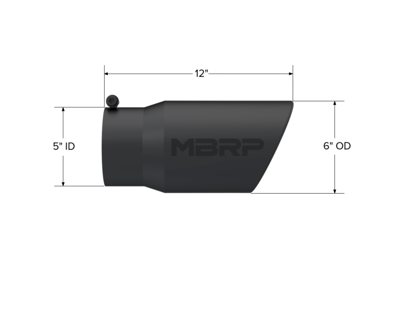 Tip. 6in. O.D. Angled Rolled End 5in. inlet 12in. length. Black Series. The exhaust tip is the crowning touch to your performance exhaust. It is your opportunity to really show off your personal style. That's why MBRP offers such a wide assortment of high quality, bolt on tips, because everybody has their own idea of style. MBRP offers T304 polished stainless, Black coated, Burnt End and Carbon Fiber tip options in various sizes. The tips are universal fit so be sure to measure your tail pipes outside diameter and match it to the MBRP tip INLET diameter before ordering. No Weld Installation.