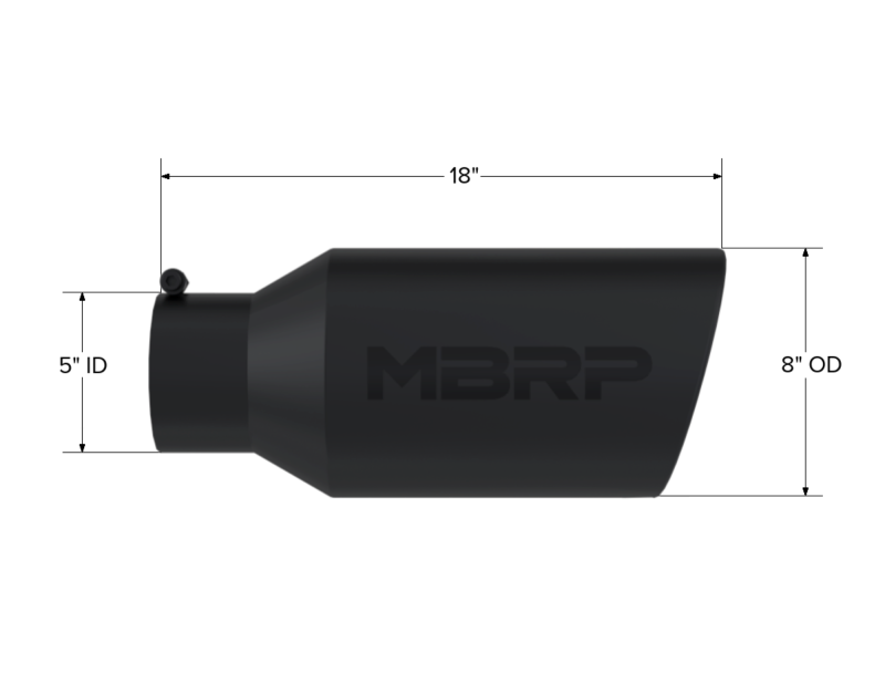 Tip. 8in. O.D.. Rolled End. 5in. inlet 18in. in length. BLK. The exhaust tip is the crowning touch to your performance exhaust. It is your opportunity to really show off your personal style. That's why MBRP offers such a wide assortment of high quality, bolt on tips, because everybody has their own idea of style. MBRP offers T304 polished stainless, Black coated, Burnt End and Carbon Fiber tip options in various sizes. The tips are universal fit so be sure to measure your tail pipes outside diameter and match it to the MBRP tip INLET diameter before ordering. No Weld Installation.