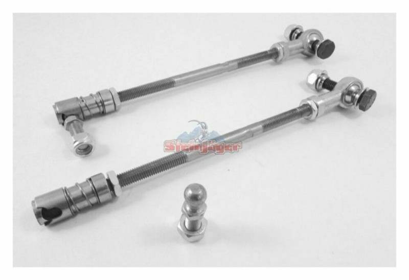 Kit includes one pair of rear adjustable sway bar end links with quick disconnects. The spherical rod end is PTFE lined and plated zinc yellow. The ball joint is plated steel with a spring loaded housing for quick disconnecting. Steinjager's Rear Sway Bar Quick Disconnects provide a quick way to disconnect your Rear sway bar. Simply pull back the spring loaded outer housing and swing the link up and out of the way.
