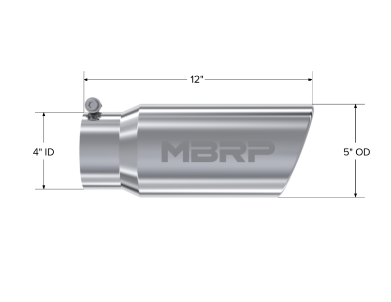 5" Inlet OD. Angled Rolled End. 4" Inlet ID. 12" Length. T304 The exhaust tip is the crowning touch to your performance exhaust. It is your opportunity to really show off your personal style. That's why MBRP offers such a wide assortment of high quality, bolt on tips, because everybody has their own idea of style. MBRP offers T304 polished stainless, Black coated, Burnt End and Carbon Fiber tip options in various sizes. The tips are universal fit so be sure to measure your tail pipes outside diameter and match it to the MBRP tip INLET diameter before ordering. No Weld Installation.