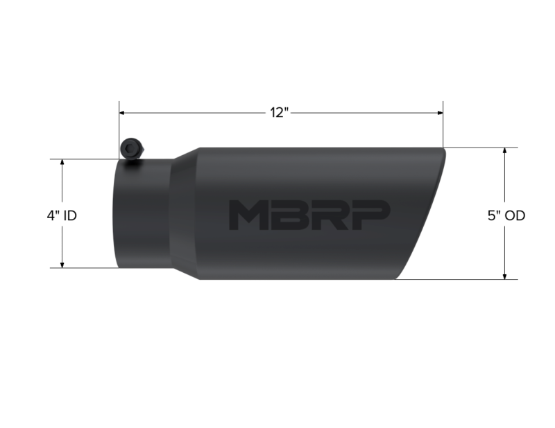 Tip. 5in. O.D. Angled Rolled End 4in. inlet 12in. Length. BLK The exhaust tip is the crowning touch to your performance exhaust. It is your opportunity to really show off your personal style. That's why MBRP offers such a wide assortment of high quality, bolt on tips, because everybody has their own idea of style. MBRP offers T304 polished stainless, Black coated, Burnt End and Carbon Fiber tip options in various sizes. The tips are universal fit so be sure to measure your tail pipes outside diameter and match it to the MBRP tip INLET diameter before ordering. No Weld Installation.