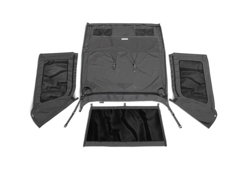 Frameless Soft Top Kit, Sailcloth The Rampage Frameless Trail Top installs over the original equipment factory roll bar for a snug fit. This unique design allows for larger side windows and improved visibility with removable side and rear windows that quickly convert the soft top into an open Safari top. Windows use heavy duty molded tooth zippers and are easily replaced or removed. The windows are also stored in a special separation panel between the ceiling and roof top which is concealed to protect the windows from scratches or puncture. The fastback style offers improved aerodynamics and a quieter ride than factory bow style tops. The windshield channel, door surrounds and tail gate bar are required. These can be purchased separately. Installs Over Factory Roll Bars W/O Factory Framework Exclusive On Board Ceiling Panel Window Storage Exclusive Anti Puddle Poles For Water Runoff DOT Compliant Dark Privacy Tint On Back Windows Sailcloth Fabric Black Diamond