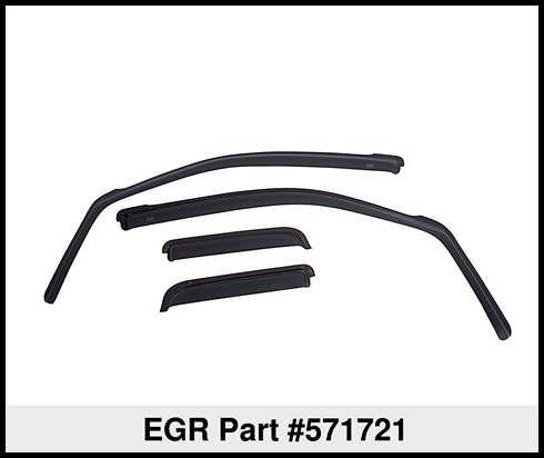 EGR Window Visors are made of a durable, scratch resistant, UV capped acrylic; which will keep your investment from fading, and keep it looking fresh for years to come. With most EGR Window Visors being available in Dark Smoke and Matte Black, customization will never be lacking for the upgrade enthusiast. EGR Window Visors feature an easy, no tools necessary, installation process; whether you choose the classic Tape-on style, or the more modern In-channel style, five minutes or less is all you need! Tape-on Visors utilize a dependable 3M adhesive tape, which will ensure that your EGR Window Visors aren’t going anywhere. All EGR Window Visors come standard with a Limited Lifetime Warranty; meaning that just like our Window Visors, EGR will always be by your side!