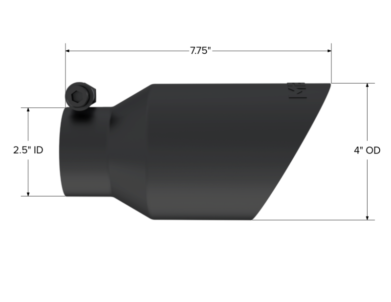 Tip. 4in. O.D.. Dual Wall Angled. 2in. inlet. 8in. length. BLK. The exhaust tip is the crowning touch to your performance exhaust. It is your opportunity to really show off your personal style. That's why MBRP offers such a wide assortment of high quality, bolt on tips, because everybody has their own idea of style. MBRP offers T304 polished stainless, Black coated, Burnt End and Carbon Fiber tip options in various sizes. The tips are universal fit so be sure to measure your tail pipes outside diameter and match it to the MBRP tip INLET diameter before ordering. No Weld Installation.