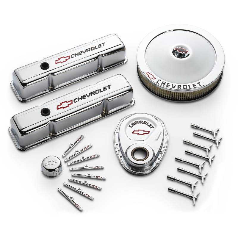 Engine Dress-Up Kit This engine dress-up kit features a great looking chrome finish with red "Bowtie" logos and black "Chevrolet" lettering. Made from high quality steel material. Designed to fit Small Block Chevy engines 1955 to 1986. Kit includes a pair of tall baffled engine valve covers, one 14 inch diameter carburetor air cleaner, one engine timing chain cover, 8 valve cover wing nuts, 8 valve cover hold downs, one push-in valve cover breather and two valve cover grommets (1 regular and 1 PCV). This is an officially licensed GM Performance Parts product. Sold as one complete kit. Backed by a limited 30 day factory warranty.