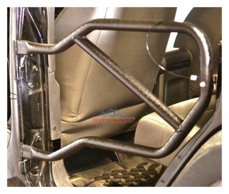 The Steinjager Tubular Trail Door's main construction is 1.25" and custom machined door hinges allow for easy switching from your stock door to the tube door. The quick release detent pin is held to the door with a weather resistant cable to ensure you don't lose your door latch pin. Please note, because of tolerances between Jeeps, you may have to slightly adjust or shim the factory striker for the latch to function smoothly. These doors accept our bolt on mirror kit but do not come with them. Includes one pair of rear tube doors.