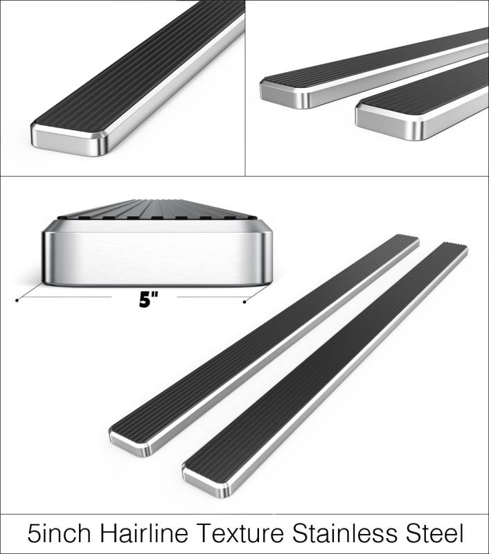 The iStep 5-inch side step/running board is constructed with durable stainless steel. Its surface is fully covered with a ribbed step pad that enhances traction while getting in and out of the vehicle, providing a secure and sturdy access. The side step's simplistic and sleek design gives your vehicle an upgraded appearance. Additionally, the iStep can support up to 300 lbs due to its heavy-duty construction. The product comes with all the necessary mounting hardware, brackets, and an installation manual.