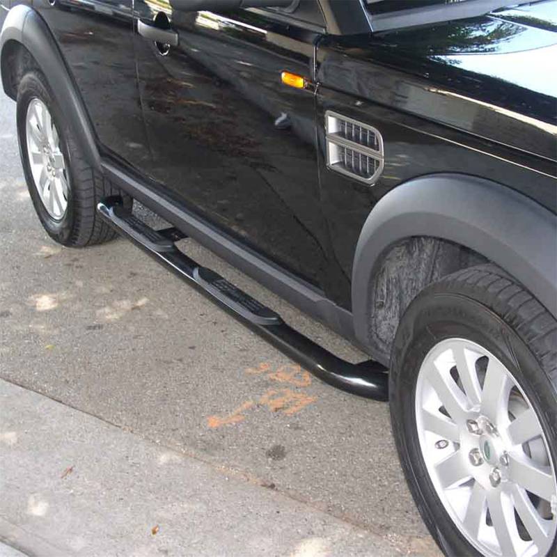 3" Round Black Steel Side Bars, Select Land Rover LR3 ARIES 3" side bars are more than a fancy decal for your truck, Jeep or SUV. They are a confident first step on each new adventure. These 3" nerf bars are constructed from strong carbon steel for superior rigidity, and they feature a sleek semi-gloss black powder coat finish. For an added edge, each nerf bar also goes through an E-coat process, before receiving its black powder coat, to strengthen and protect the final finish against peeling, chipping and scratching. ARIES 3" round side bars are also available in polished stainless steel or semi-gloss black powder-coated steel. All ARIES 3" nerf bars come with heavy-duty steel brackets and non-skid step pads. The mounting brackets are strong and custom-designed for specific makes and models to allow the side bars to contour to the lines of your vehicle. They offer easy installation and the strength necessary to provide sound footing. These particular custom nerf bars fit specific years of the Land Rover LR3 (see application info to verify fitment). ARIES 3" round side bars also come with non-skid step pads made of tough polypropylene. These step pads feature a textured pattern for enhanced safety, and they cover a wide portion of the tubes for a more comfortable step. Unique bends to contour to the body of the vehicle Custom, non-skid step pads for safe entry and exit 3" diameter, heavy-wall tube design High-strength carbon steel construction Highly rust-resistant semi-gloss black powder coat and E-coat finish