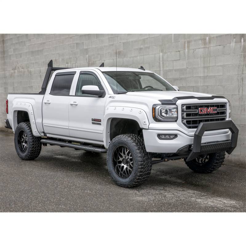 AdvantEDGE 5-1/2" Black Aluminum Bull Bar, Select Silverado, Sierra 2500, 3500 The ARIES AdvantEDGE bull bar sets itself apart with a modern, angular design and all-aluminum construction. It features a track system for mounting auxiliary lights, vehicle-specific mounting brackets and is available in two finish options, allowing you to choose the look that perfectly matches your vehicle. Designed to complement the style of today's pickup trucks, the AdvantEDGE bull bar is as bold as it is tough. Instead of the common, rounded frame of most bull bars and grille guards, AdvantEDGE features a unique, 5-1/2" wide, eight-sided tube profile. Not only does the angled frame better accent the design of modern trucks, but it also offers a strong build. Like the AdvantEDGE headache rack and AdvantEDGE side bars, the AdvantEDGE bull bar is made entirely from aluminum, allowing it to be lightweight and rust-free. The tubular frame is also protected by a durable finish of carbide black powder coat or chrome powder coat. Each AdvantEDGE bull bar is fitted with a textured black aluminum cover plate on the crossbar, making it even more unique. The crossbar can be flipped to expose a track system for mounting LED light bars, work lights or other aftermarket lighting options. It is also available with integrated, flush-mount LED lights. Because each application is made for a custom fit, installation of the AdvantEDGE bull bar is simple and secure. It uses a track mounting system and vehicle-specific brackets to bolt onto pre-existing factory holes in the vehicle's frame. This speeds up installation and offers maximum rigidity. This particular AdvantEDGE bull bar is designed to fit specific years of the Chevrolet Silverado and GMC Sierra 2500 HD and 3500 HD (see application info to verify fitment). The AdvantEDGE bull bar is made to complement our AdvantEDGE side bars and AdvantEDGE headache rack, giving you a complete look for your truck and a style unlike any other. Unique, eight-sided tube profile to complement the style of modern trucks Extruded, all-aluminum construction to be strong, lightweight and rust-free Crossbar can be flipped to mount LED light bars or work lights Stamped aluminum, octagonal grid cover plate for a distinct look Tough carbide black powder coat finish with textured black cover plate