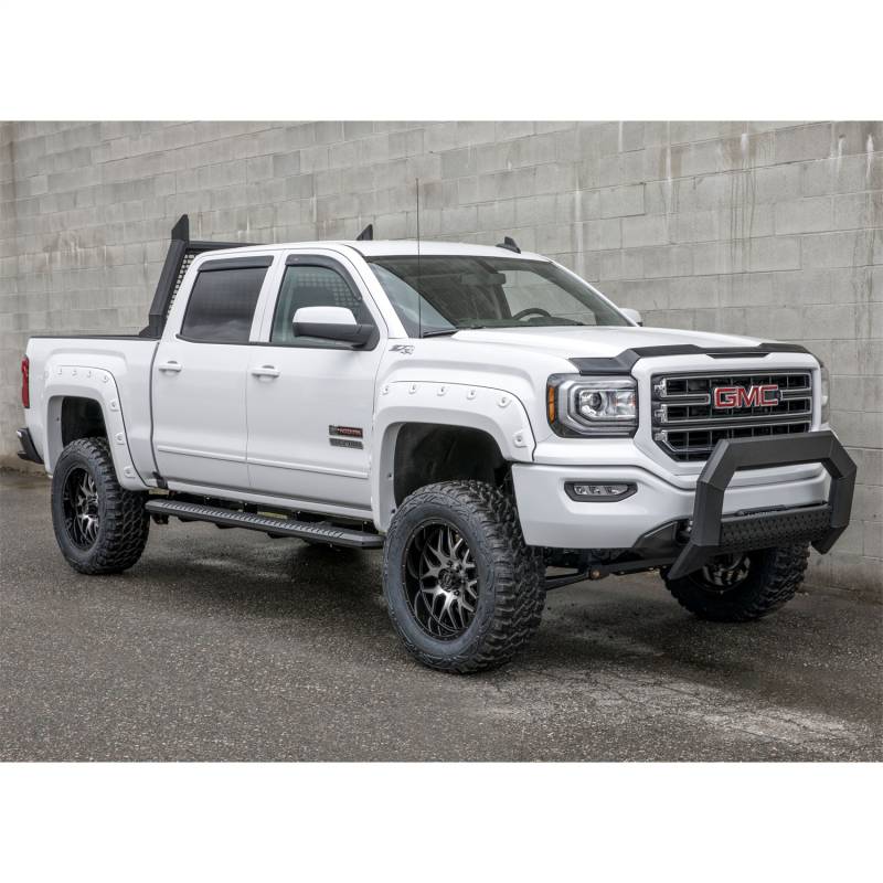 The ARIES AdvantEDGE bull bar sets itself apart with a modern, angular design and all-aluminum construction. It features a track system for mounting auxiliary lights, vehicle-specific mounting brackets and is available in two finish options, allowing you to choose the look that perfectly matches your vehicle. Designed to complement the style of todays pickup trucks, the AdvantEDGE bull bar is as bold as it is tough. Instead of the common, rounded frame of most bull bars and grille guards, AdvantEDGE features a unique, 5-1/2 in. wide, eight-sided tube profile. Not only does the angled frame better accent the design of modern trucks, but it also offers a strong build. Like the AdvantEDGE headache rack and AdvantEDGE side bars, the AdvantEDGE bull bar is made entirely from aluminum, allowing it to be lightweight and rust-free. The tubular frame is also protected by a durable finish of carbide black powder coat or chrome powder coat. Each AdvantEDGE bull bar is fitted with a textured black aluminum cover plate on the crossbar, making it even more unique. The crossbar can be flipped to expose a track system for mounting LED light bars, work lights or other aftermarket lighting options. It is also available with integrated, flush-mount LED lights. Because each application is made for a custom fit, installation of the AdvantEDGE bull bar is simple and secure. It uses a track mounting system and vehicle-specific brackets to bolt onto pre-existing factory holes in the vehicles frame. This speeds up installation and offers maximum rigidity. This particular AdvantEDGE bull bar is designed to fit specific years of the Chevy Silverado 2500 HD or 3500 HD and GMC Sierra 2500 HD or 3500 HD (see application info to verify fitment). The AdvantEDGE bull bar is made to complement our AdvantEDGE side bars and AdvantEDGE headache rack, giving you a complete look for your truck and a style unlike any other.