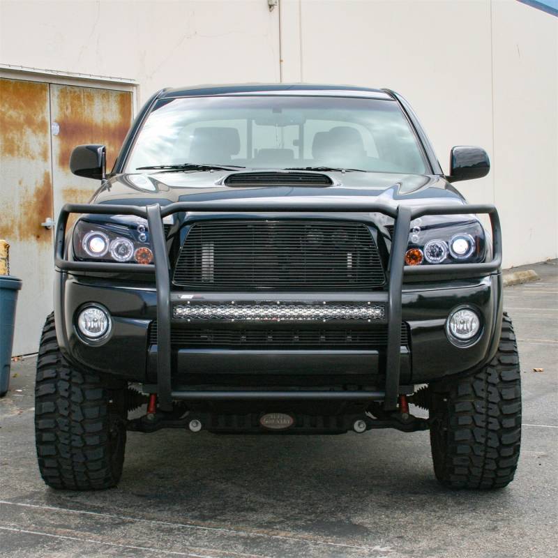 Pro Series Black Steel Grille Guard with Light Bar, Select Toyota Tacoma The ARIES Pro Series grille guard is unlike any other grille guard or brush guard on the road today because of its patented center crossbar. The ARIES Pro Series grille guard has a unique center crossbar that houses an LED light bar, allowing you to truly set your truck apart from all others. Rather than using a set of light clips or forcing you to drill holes into the frame, the aerodynamic crossbar of the Pro Series grille guard is the light bar housing itself. It uses a 30" slotted channel bracket to mount the included 30" LED light bar #1501264. The bracket can also accept other single-row light bars (some 30" light bars may not fit). The crossbar mount can also articulate, allowing you to position the light beam at any angle you prefer. Integrating the channel mount into the crossbar housing also keeps the light bar protected from the elements. To further stylize your truck, the Pro Series grille guard also comes with an interchangeable grille guard cover plate. Included with each grille guard is a black mesh cover plate that easily bolts on and provides added security for your aftermarket lights. The mesh cover plate can be swapped out with other cover plate options, including five different styl es and two finishes. Solid construction should be an essential feature of any grille guard, and the Pro Series grille guard is more than qualified. It has a one-piece design of 1/4" thick welded plates and 1-1/2" mandrel-bent carbon steel tubing. We also finish each Pro Series grille guard in a highly durable, dual-layer E-coat and textured black powder coat, giving it resilience to rust and scratches. This unique finish also helps hide minor scratches and grime to maintain a clean look. ARIES Pro Series grille guards are made vehicle-specific for seamless integration with the factory bumper and an easy, no-drill installation. This grille guard fits select model years of the Toyota Tacoma (see application info to verify fitment). Patented crossbar houses a single-row LED light bar Interchangeable cover plate protects light bar and offers easy customization Grade-A LED chips offer 14,800-lumen, combo beam pattern Light bar features waterproof aluminum housing and IP68-standard breather Fitted with a strong, waterproof wiring harness for a reliable connection