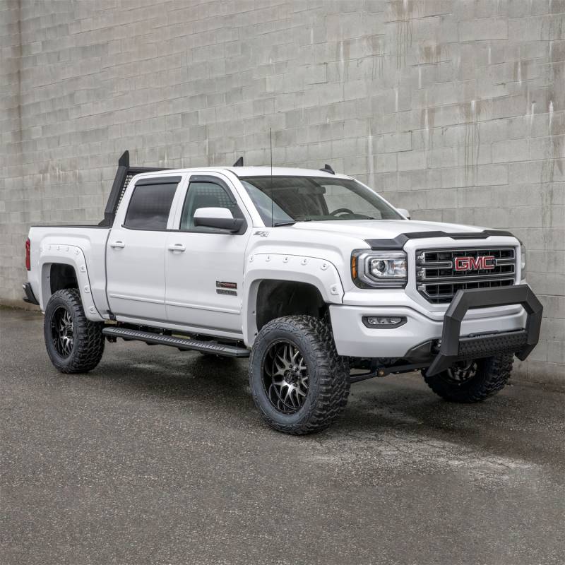 AdvantEDGE 5-1/2" x 91" Black Aluminum Side Bars, Select Silverado, Sierra ARIES AdvantEDGE side bars do away with the common, rounded look of other side bars, nerf bars and running boards, featuring an angular, eight-sided tube profile and powder-coated all-aluminum construction. The angular edges provide a clear-cut, uncompromising accent for the look of today's trucks. Made from 5-1/2" wide, eight-sided, extruded aluminum tubing, AdvantEDGE running boards are strong, lightweight and impervious to rust, offering a solid step that is built to face the elements and outlast them. They also come with die-cast aluminum end caps and a stamped aluminum tread. The aluminum treads provide a long-lasting, non-skid stepping surface that will not crack or fade in the sun. ARIES AdvantEDGE side bars are also marked for their easy, custom-fit installation. They feature the ARIES VersaTrac mounting system with brackets that are made from powder-coated steel and built for specific vehicles. This particular set of custom running boards fits specific years of the Chevy Silverado 2500 HD, 2500 HD Classic, 3500 HD or 3500 Classic and GMC Sierra 2500 HD, 2500 HD Classic, 3500 HD or 3500 Classic (see application info to verify compatibility). The high-strength steel brackets mount using pre-existing holes, and the aluminum running boards attach to the brackets with heavy-duty hardware. The VersaTrac mounting system makes installation simple and customizable, allowing the side bars to be swapped out at any time with other side steps or running boards that use the VersaTrac system. Setting yourself apart is simple with the ARIES AdvantEDGE series. In addition to these truck side steps, we also offer the AdvantEDGE bull bar and AdvantEDGE headache rack, featuring the same all-aluminum construction and eight-sided tube profile. For a fully customized look to match your pickup, AdvantEDGE side bars are available in two finish options, including carbide b lack powder coat and chrome powder coat. Unique, eight-sided tube profile to complement the style of modern trucks Offers 6" of additional length, reaching the edge of the cab Extruded, all-aluminum construction to be strong, lightweight and rust-free Stamped aluminum treads for a non-skid step that will never crack or fade Die-cast aluminum end caps for a durable accent