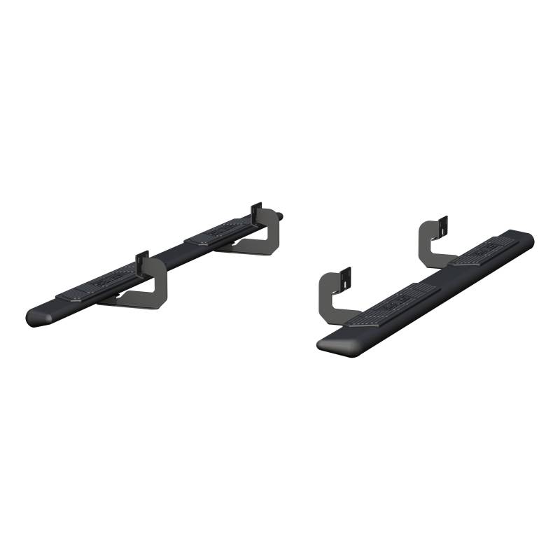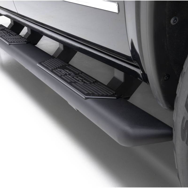 AscentStep 5-1/2" x 85" Black Steel Running Boards, Select Ford F-150 ARIES AscentSteps are truly modern running boards for today's trucks and SUVs. They feature an elegant teardrop profile, highly unique dual-constructed step pads, a rigid and rust-resistant build and a no-drill installation. AscentStep running boards are set apart from other, common oval side steps with their stylish, distinctive teardrop shape. The boards are rounded on the ends with seamlessly blended end caps, giving them subtle, superior style to complement your truck. The step pads of these running boards are also unique, featuring a two-part construction. They are comprised of a polyethylene tread base and a metal plate overlay. The poly treads protrude through the overlay, providing an aggressive accent and non-skid traction for a safe stepping surface. The stainless steel plates also help protect the running boards from scuffs, scratches and rust caused by frequent foot traffic. AscentStep running boards offer excellent rigidity with their high-strength steel construction. The steel is covered with a durable carbide black powder coat finish for dependable corrosion, scratch and UV resistance and for a clean, sleek look on your truck or SUV. Every set of ARIES AscentStep running boards is made for vehicle-specific application. This ensures optimal integration with the truck without any drilling or difficult modifications required. This particular set of custom running boards fits certain years of the Ford F150 (see application info to verify fitment). Additionally, AscentSteps are equipped with the VersaTrac system, meaning once the brackets are installed, they can accept other running boards or side steps with the VersaTrac system. This makes installation and customization easy. Stylish and modern teardrop design for a unique look Aggressive, integrated step pads blend steel with non-skid, poly tread Polyethylene tread raised through stainless overlay for maximum traction Stainless steel tread plates resist corrosion in spite of heavy foot traffic Rigid steel construction with sleek, durable carbide black powder coat finish