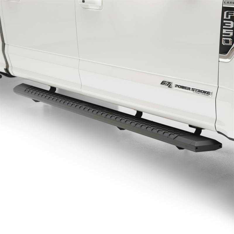 AdvantEDGE 5-1/2" x 91" Black Aluminum Side Bars, Select Ford F-Series Crew Cab ARIES AdvantEDGE side bars do away with the common, rounded look of other side bars, nerf bars and running boards, featuring an angular, eight-sided tube profile and powder-coated all-aluminum construction. The angular edges provide a clear-cut, uncompromising accent for the look of today's trucks. Made from 5-1/2" wide, eight-sided, extruded aluminum tubing, AdvantEDGE running boards are strong, lightweight and impervious to rust, offering a solid step that is built to face the elements and outlast them. They also come with die-cast aluminum end caps and a stamped aluminum tread. The aluminum treads provide a long-lasting, non-skid stepping surface that will not crack or fade in the sun. ARIES AdvantEDGE side bars are also marked for their easy, custom-fit installation. They feature the ARIES VersaTrac mounting system with brackets that are made from powder-coated steel and built for specific vehicles. This particular set of custom running boards fits specific years of the Ford F-150, F-150 Lightning, F-250 Super Duty, F-350 Super Duty, F-450 Super Duty and F-550 Super Duty crew cab (see application info to verify compatibility). The high-strength steel brackets mount using pre-existing holes, a nd the aluminum running boards attach to the brackets with heavy-duty hardware. The VersaTrac mounting system makes installation simple and customizable, allowing the side bars to be swapped out at any time with other side steps or running boards that use the VersaTrac system. Setting yourself apart is simple with the ARIES AdvantEDGE series. In addition to these truck side steps, we also offer the AdvantEDGE bull bar and AdvantEDGE headache rack, featuring the same all-aluminum construction and eight-sided tube profile. For a fully customized look to match your pickup, AdvantEDGE side bars are available in two finish options, including carbide black powder coat and chrome powder coat. Unique, eight-sided tube profile to complement the style of modern trucks Offers 6" of additional length, reaching the edge of the cab Extruded, all-aluminum construction to be strong, lightweight and rust-free Stamped aluminum treads for a non-skid step that will never crack or fade Die-cast aluminum end caps for a durable accent