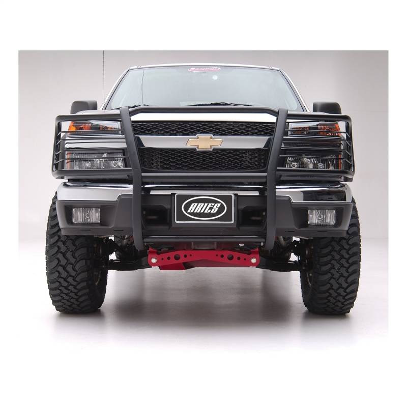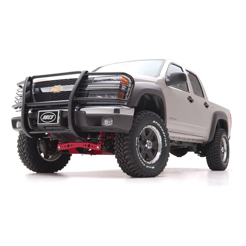 Black Steel Grille Guard, Select Chevrolet Colorado, GMC Canyon For the conqueror in every truck, Jeep or SUV owner, the ARIES grille guard offers the tough, trail-ready look you demand. It begins with a one-piece frame of 1/4" thick welded plates and 1-1/2" mandrel-bent tubing for a solid build. Each one is made with a vehicle-specific design for a better fit, easier install and more secure mounting. The side brush guards are custom-bent to contour to the profile of your vehicle, while the mounting brackets are positioned for a no-drill application. This means pre-existing factory holes are used to ensure optimum fitment and less vibration. This particular custom grille guard fits specific years of the Chevy Colorado and GMC Canyon (see application info to verify). The ARIES grille guard also makes it easy to customize the look of your vehicle. Not only does the crossbar have two pre-drilled holes for mounting aftermarket LED lights, but many of our grille guards are also available in two finish options -- polished stainless steel or semi-gloss black steel. The stainless steel grille guard is made with 304 stainless, being high in nickel content and truly resistant to rust and corrosion. This option comes with a mirror-like polished finish for a definitive shine. The semi-gloss black grille guard is made with high-strength carbon steel for added strength. It features a tough, dual-layer E-coat and black powder coat finish to protect against rust, scratches and the elements. All ARIES grille guards also come with rubber stripping along the risers to protect the frame against scuffs and scratches. One-piece, 1-1/2" diameter, heavy-wall tube design High-strength carbon steel construction Dual-layer E-coat and black powder coat finish for maximum corrosion resistance Two pre-drilled holes in the crossbar for mounting LED light bars or work lights Removable headlight cages for extra protection and a customizable look
