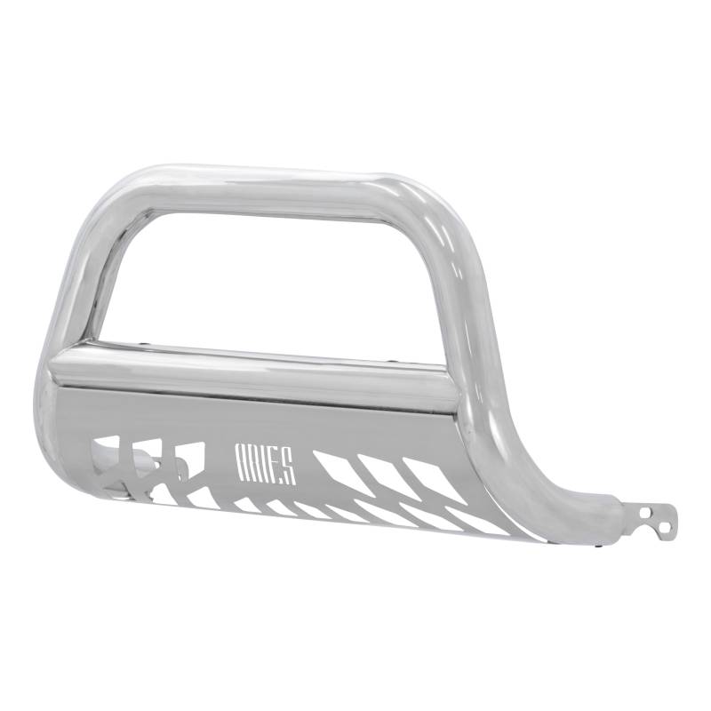 From the cattle rancher on the open range to the industrial man of the asphalt jungle to the jerky-jawing trail hog of the north woods, the ARIES 3 in. bull bar is made for those who face the uncertain road without fear. This particular model is constructed from 304 stainless steel. 304 stainless is high in nickel content, allowing the bull bar to easily resist water, road salt and rust and maintain its mirror-like polished finish in spite of the elements. Other available finishes include high-gloss black stainless steel, textured black steel and semi-gloss black steel. Customizing the look of your vehicle is simple with the ARIES 3 in. bull bar. It is equipped with pre-drilled light mounting holes and a removable skid plate. The center crossbar features two pre-drilled holes that readily accept an LED light bar or two LED work lights. The skid plate is made from 304 stainless steel and has a brushed finish to stop rust and hide scratches and scuffs. It also features an aggressive, ARIES-exclusive cutout pattern and can be removed for a customized look. Each ARIES 3 in. bull bar is made a vehicle-specific design, meaning that for each make and model, the bull bar has a custom bend and unique mounting brackets. This allows for the best possible fit on your vehicle and ensures solid attachment. The brackets also use pre-existing factory holes in the vehicles frame to eliminate drilling, speed up installation and increase rigidity. For a different breed of bull bar, ARIES has what youre looking for.