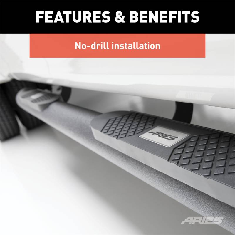 Step into your truck like you mean it with ARIES Big Step 4 in. round side bars. When it comes to your truck, Jeep or SUV, dont waste time with accessories that miss the mark. You need solid parts with plenty of attitude. ARIES Big Step nerf bars are made to be bigger, bolder and longer-lasting, featuring a powder-coated aluminum construction. These aluminum nerf bars are 40% lighter than steel and offer excellent strength and rigidity. They are also highly impervious to corrosion and are coated in a textured black finish to protect against scratching and scuffs. Some of the features that make the ARIES 4 in. side bar a bold accessory are its mandrel-bent ends and extra-large step pads. The ends offer a unique look compared to capped ends and give the side bars a more contoured appearance. The custom step pads provide a generous width for more comfortable footing, and the textured pads are made from polypropylene so they will not crack or get slippery when wet. ARIES Big Step 4 in. round nerf bars are compatible with a variety of trucks, Jeeps and SUVs. The vehicle-specific mounting brackets are designed for a custom fit on each unique application, and they allow you to use factory mounting holes for a no-drill installation. This set of custom side bars fits specific years of the Nissan Titan and Titan XD (see application info to verify fitment). ARIES Big Step 4 in. round side bars are also designed to go hand-in-hand with the ARIES Big Horn bull bar, giving you a complete look for your custom ride.