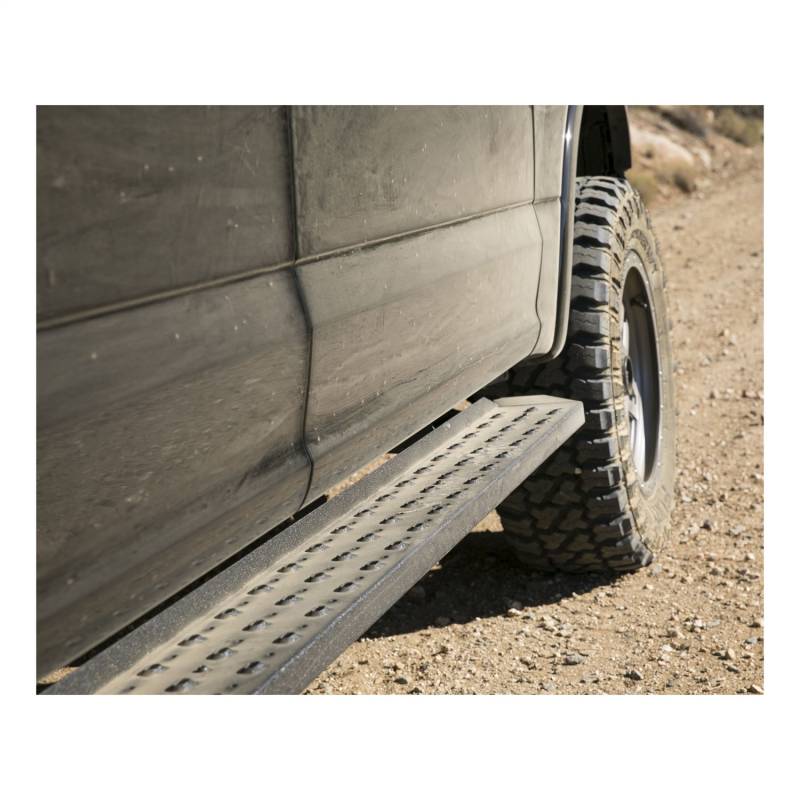 RidgeStep 6-1/2" x 85" Black Steel Running Boards (No Brackets) Powerful, definitive and uncompromising as a mountain ridge, ARIES RidgeStep running boards are made for the truck owner who gets it done, day after day. With their solid, all-steel construction, non-skid treads and tough powder coat finish, RidgeStep running boards are made to finish the job. Installation of these running boards is easy and secure because they use the ARIES VersaTrac mounting system. The underside of each board is equipped with a channel that accepts a set of heavy-duty bracket inserts. The inserts move along the channel to fit your vehicle, and the mounting hardware provides a secure attachment. The boards are made in four base lengths, including 53", 75", 85" and 91", and they are designed for vehicle-specific application (NOTE: VersaTrac mounting brackets are sold separately; see the application information to determine which brackets and boards fit your vehicle). ARIES RidgeStep running boards are not only made for easier installation, but they are also built to face the harsh elements of the commercial job. They feature high-strength, solid steel construction for a step that can keep up with those steel-toe boots, and they are completely without plastic parts, meaning they will not crack or fade over time. Their stamped, all-steel tread offers a 6-1/2" wide, non-skid surface that will never wear down no matter how many times you climb in and out of your truck. The end caps are also made from steel and are welded to contour to the body of your vehicle for a professional finish. RidgeStep running boards come with a unique E-coat and textured black powder coat finish to not only withstand rust but also to hide minor scratches and grime. From the cattle ranch of the arid desert plains to the forgotten forest trails of the frozen tundra, the job doesn't wait for those who lag behind. Rise to the challenge and master the job with ARIES RidgeStep running boards. High-strength, all-steel construction with no plastic parts Angular design for a tough, no-nonsense look on hardworking trucks Stamped steel treads for a non-skid step that will never wear or crack Flat profile and 6-1/2" width provide a comfortable step Textured black powder coat easily hides minor scratches and grime