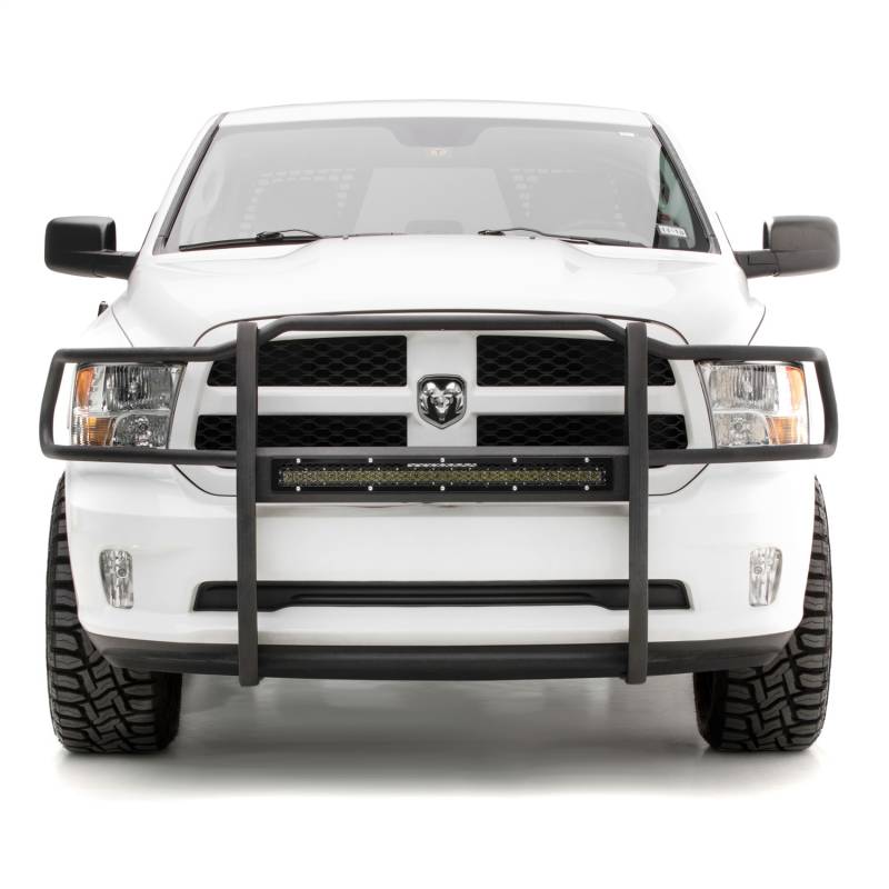 Pro Series Black Steel Grille Guard, Select Dodge, Ram 2500, 3500 The ARIES Pro Series grille guard is unlike any other grille guard or brush guard on the road today because of its patented center crossbar. The ARIES Pro Series grille guard has a unique center crossbar that is able to house an LED light bar, allowing you to truly set your truck apart from all others. Rather than using a set of light clips or forcing you to drill holes into the frame, the aerodynamic crossbar of the Pro Series grille guard is the light bar housing itself. It uses a 30" slotted channel bracket to accept one or more single-row light bars (light bars not included; some 30" light bars may not fit the channel bracket). The crossbar mount can also articulate, allowing you to position the light beam at any angle you prefer. Integrating the channel mount into the crossbar housing also keeps the light bar protected from the elements. To further stylize your truck, the Pro Series grille guard also comes with an interchangeable grille guard cover plate. Included with each grille guard is a black mesh cover plate that easily bolts on and provides added security for your aftermarket lights. The mesh cover plate can be swapped out with other cover plate options, including five different styles and two finishes. Solid construction should be an essential feature of any grille guard, and the Pro Series grille guard is more than qualified. It has a one-piece design of 1/4" thick welded plates and 1-1/2" mandrel-bent carbon steel tubing. We also finish each Pro Series grille guard in a highly durable, dual-layer E-coat and textured black powder coat, giving it resilience to rust and scratches. This unique finish also helps hide minor scratches and grime to maintain a clean look. ARIES Pro Series grille guards are made vehicle-specific for seamless integration with the factory bumper and an easy, no-drill installation. This grille guard fits select model years of the Ram 2500 and 3500 and Dodge Ram 2500 and 3500 (see application info to verify fitment). Patented crossbar houses a single-row LED light bar (light bar not included) Interchangeable cover plate protects light bar and offers easy customization Channel-style bracket accepts one or multiple light bars Articulating bracket allows light to be mounted at a custom angle Textured black powder coat easily hides minor scratches and grime