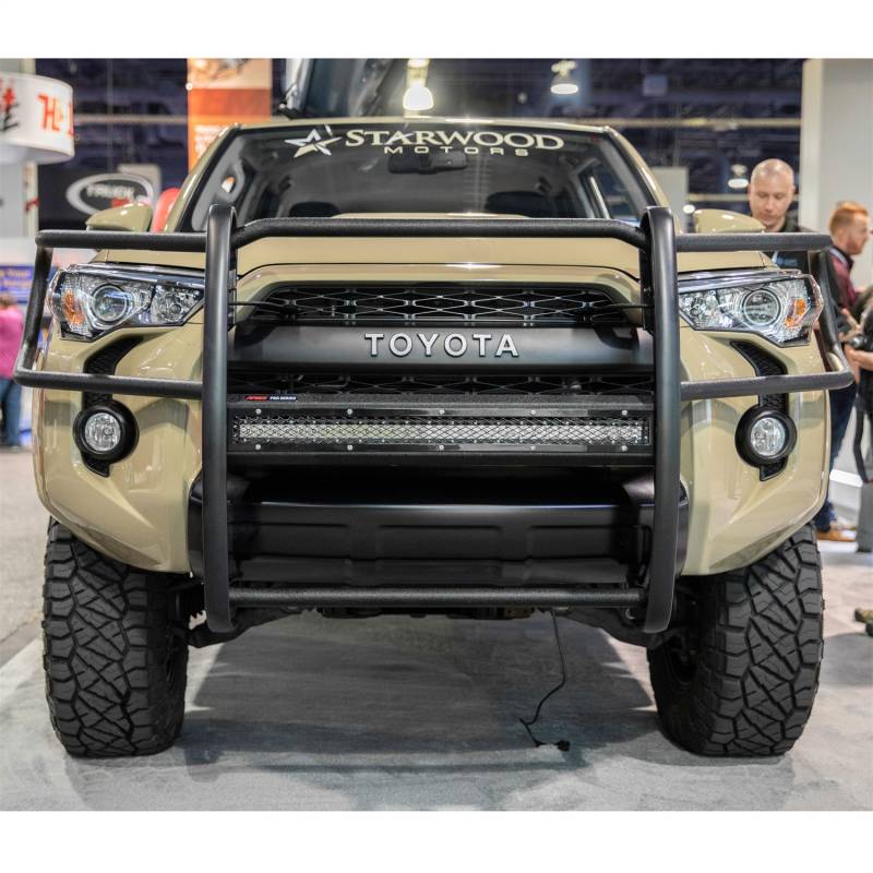 Pro Series Black Steel Grille Guard, Select Toyota 4Runner The ARIES Pro Series grille guard is unlike any other grille guard or brush guard on the road today because of its patented center crossbar. The ARIES Pro Series grille guard has a unique center crossbar that is able to house an LED light bar, allowing you to truly set your truck apart from all others. Rather than using a set of light clips or forcing you to drill holes into the frame, the aerodynamic crossbar of the Pro Series grille guard is the light bar housing itself. It uses a 30" slotted channel bracket to accept one or more single-row light bars (light bars not included; some 30" light bars may not fit the channel bracket). The crossbar mount can also articulate, allowing you to position the light beam at any angle you prefer. Integrating the channel mount into the crossbar housing also keeps the light bar protected from the elements. To further stylize your truck, the Pro Series grille guard also comes with an interchangeable grille guard cover plate. Included with each grille guard is a black mesh cover plate that easily bolts on and provides added security for your aftermarket lights. The mesh cover plate can be swapped out with other cover plate options, including five different styles and two finishes. Solid construction should be an essential feature of any grille guard, and the Pro Series grille guard is more than qualified. It has a one-piece design of 1/4" thick welded plates and 1-1/2" mandrel-bent carbon steel tubing. We also finish each Pro Series grille guard in a highly durable, dual-layer E-coat and textured black powder coat, giving it resilience to rust and scratches. This unique finish also helps hide minor scratches and grime to maintain a clean look. ARIES Pro Series grille guards are made vehicle-specific for seamless integration with the factory bumper and an easy, no-drill installation. This grille guard fits select model years of the Toyota 4Runner (see application info to verify fitment). Patented crossbar houses a single-row LED light bar (light bar not included) Interchangeable cover plate protects light bar and offers easy customization Channel-style bracket accepts one or multiple light bars Articulating bracket allows light to be mounted at a custom angle Textured black powder coat easily hides minor scratches and grime