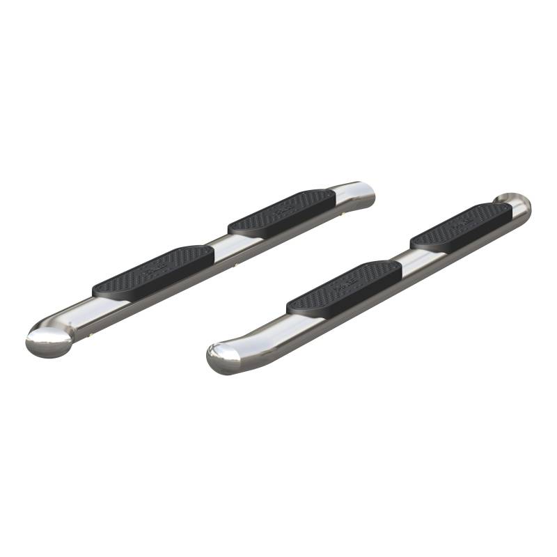 4" Polished Stainless Oval Side Bars, Select Dodge, Ram 1500 When you start and end your day turning the ignition of your truck, unreliable footing just is not an option. You need a step that can bear weight with ease, provide comfortable footing and look good doing it. ARIES 4" oval side bars are sleek, strong and custom-fitted to be a highly functional extension of your truck. ARIES 4" oval side bars are made with strong 4" elliptical tubing and are available in two different finish options to allow for full customization: polished stainless steel and black powder coat carbon steel. This set of side bars is constructed from 304 stainless steel, meaning high nickel content to be truly stainless. They easily resist rust and corrosion and feature a highly polished finish that is made to last. Something that sets the ARIES 4" oval side bar apart from all others is its blended end caps and OE-style bends. Rather than capping our side bars with a plastic cap, we offer a blended end cap for a smooth, finished appearance. We also equip the ends with a special 20-degree bend and original equipment styling to perfectly contour to your vehicle. ARIES 4" oval side bars are fitted with raised step pads to provide a wide stepping surface. The polypropylene construction will not crack over time, and because it has a textured grip, the surface is highly resistant to slips and skids, even when wet. Installation of ARIES 4" oval side bars is quick and easy with custom-fitted mounting brackets and no drilling necessary. These nerf bars fit select model years of the Ram 1500, 1500 Classic and Dodge Ram 1500 (see application info to verify fitment). 20-degree bends to contour to the body of the vehicle Seamless, welded end caps for a superior, finished look Raised, custom, non-skid step pads for safe, comfortable entry and exit 304 stainless steel construction to be strong and truly rust-resistant Mirror-like polished stainless steel finish for a bright, clean accent