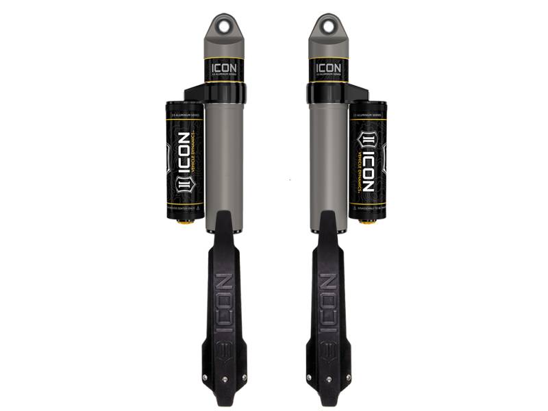 20-23 JT 1.5" REAR 2.5 VS PB PAIR ICON Vehicle Specific (V.S.) 2.5 Aluminum Series shocks are designed and built to give your vehicle outstanding performance off-road and a smooth ride on the street. These shocks are configured specifically for each application in both length and damping tune. Like all ICON'S Shock Absorbers, V.S. 2.5 Aluminum Series shocks are 100% rebuildable and 100% revalveable. For piggyback and specific remote reservoir applications, ICON'S unique use of a 6061 billet aluminum manifold a few inches below the top cap of the shock creates an internal Bump Zone that when used creates an additional 20% of damping force. This additional force helps prevent harsh bottom outs and controls the suspension when compressing at high velocity. If you are looking for a more user defined tune, consider looking into the Compression Damping Control Valve (CDCV). Shin guards are also included with this application to help protect the shock shafts from debris strikes during off-road use. ICON’s internal “Bump Zone” increases damping by 20% to provide more control as the shock approaches full compression Remote reservoir design improves heat dissipation to reduce shock fade during prolonged use Premium grade 5WT shock oil for consistent suspension damping along a wide temperature range Nitrogen charged monotube design with piggyback reservoir One piece digressive piston design with vehicle specific valving for unsurpassed performance and ride quality on and off-road