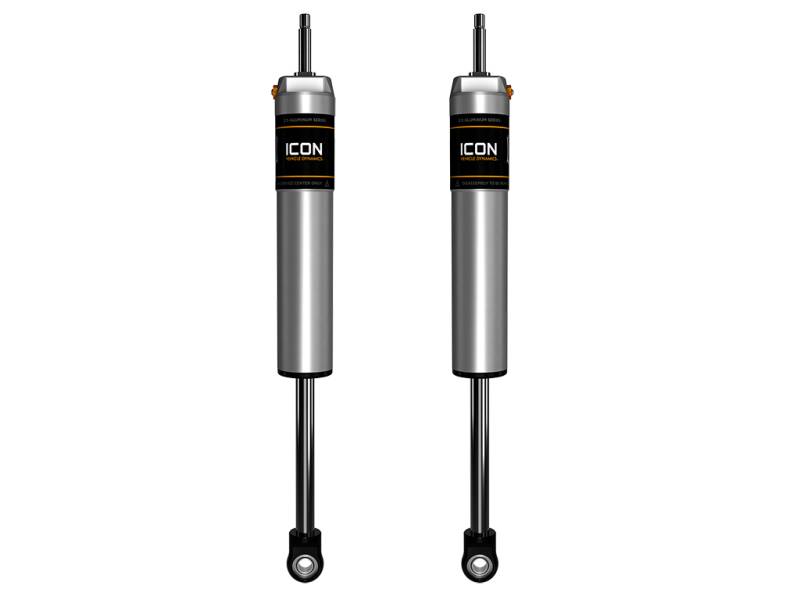08-UP LC 200 0-2" REAR 2.5 VS NR PAIR ICON Vehicle Specific (V.S.) 2.5 Aluminum Series shocks are designed and built to give your vehicle outstanding performance off-road and a smooth ride on the street. These shocks are configured specifically for each application in both length and damping tune. Like all ICON'S Shock Absorbers, V.S. 2.5 Aluminum Series shocks are 100% rebuildable and 100% revalveable. The larger diameter and oil volume of ICON 2.5 IR Series shocks provide better ride quality and heat dissipation properties than the standard 2.0 Aluminum Series IR Shocks. If you are looking for a more user defined tune, consider looking into the Compression Damping Control Valve (CDC Valve) or the Omega Series bypass shocks. One-piece digressive piston design with vehicle specific valving for unsurpassed performance and ride quality on and off-road Increase in strength and heat dissipation when compared to ICON V.S. 2.0 Series shocks Nitrogen charged monotube design with internal reservoir Polyurethane bushings and forged steel mounting stems for OE factory type fitment PTFE lined spherical bearings and application specific mounting hardware