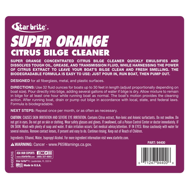 At the heart of our Super Orange Citrus Bilge Cleaner is a unique citrus extract formula. This natural powerhouse is designed to tackle and break down even the toughest oil and grease residues, leaving your bilge spotlessly clean. What's more, this formula is fully biodegradable, making it a responsible choice for the environment. Not only does our cleaner excel in efficiency, but it also leaves behind a refreshing citrus scent, transforming your bilge from a typically overlooked area into a pleasantly fragrant space. This lasting freshness is just one of the many benefits of choosing STAR BRITE's innovative cleaning solution.\nUsing our cleaner is remarkably simple and efficient. Just pour 32 ounces for every 25 feet of boat length directly into the bilge. If your bilge is dry, add several gallons of water to aid the process. Allow the mixture to sit for at least an hour while you run the boat as normal. The natural motion of the boat provides an effective "scrubbing" action. Once done, drain or pump out the bilge in compliance with local, state, and federal regulations.\nThis product is also compatible with Star brite's Maxi-Boom for situations where the bilge contains fuel or oil, ensuring a comprehensive clean. Safe for use on various materials, including fiberglass, metal, and plastic, our Super Orange Citrus Bilge Cleaner ensures that vital components like rubber hoses and wiring are not damaged during the cleaning process.\nChoose STAR BRITE Super Orange Citrus Bilge Cleaner for a simple, effective, and environmentally responsible way to keep your bilge in pristine condition.